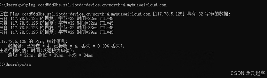 打开命令提示符终端Ping华为云设备接入IP地址