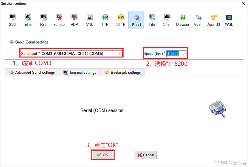 在 Serial Port中选择 COM3(即在8.3.2中查看的串口号),在 Speed中选择 115200,最后点击 OK。如下图所示: