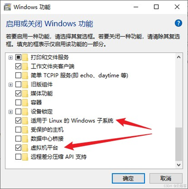 勾选“适用于Linux的Windows子系统”和“虚拟机平台”选项,具体如下所示: