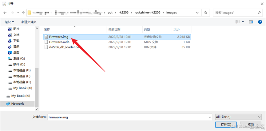 弹出打开对话框,选择主目录下 out/rk2206/lockzhiner-rk2206/images,选中 Firmware.img文件。如下图所示: