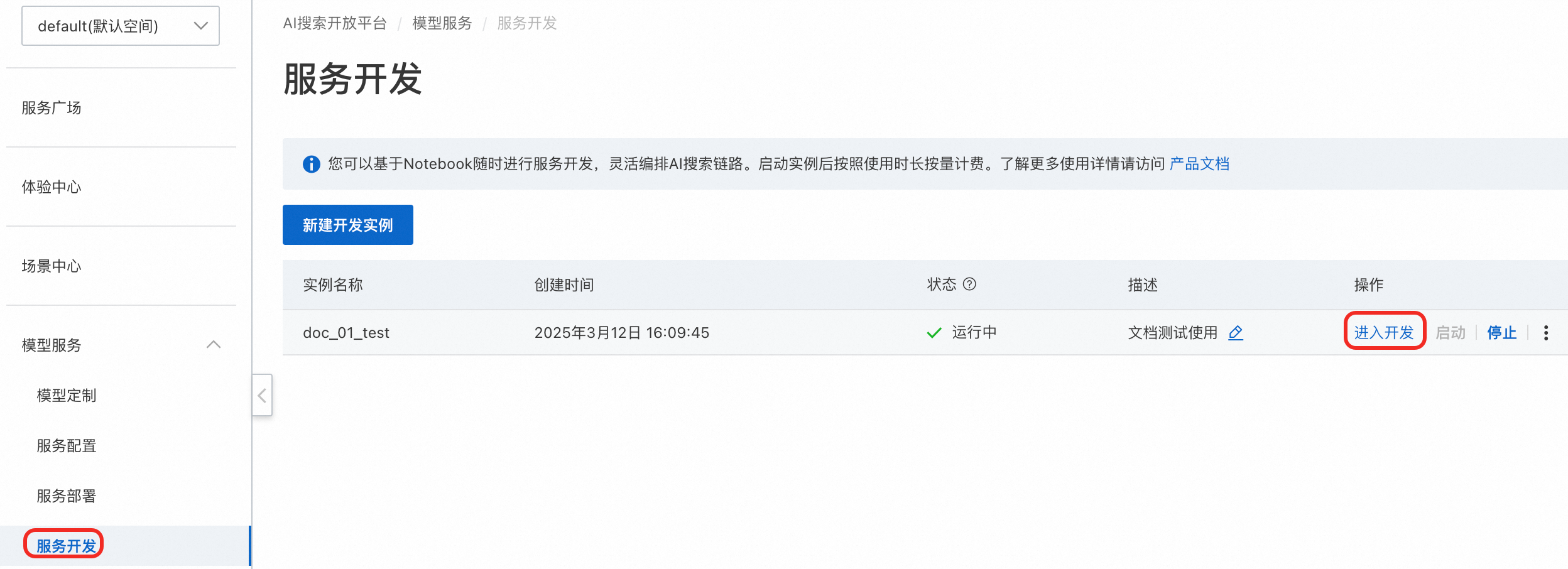 在AI搜索开放平台选择模型服务>服务开发,然后单击新建开发实例。