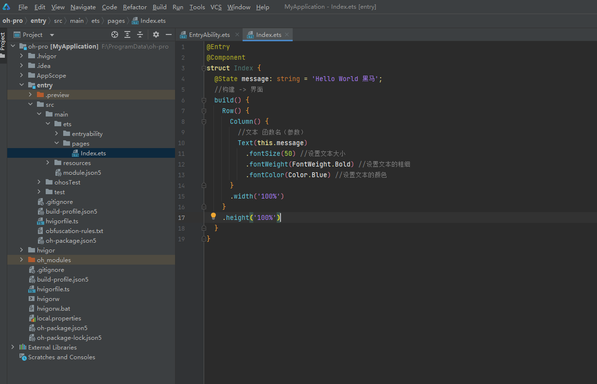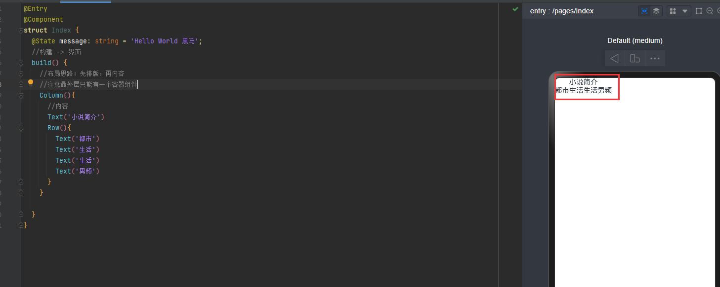 学习界面开发:build里面写代码,预览器看效果。开发工具:DevEco Studio。