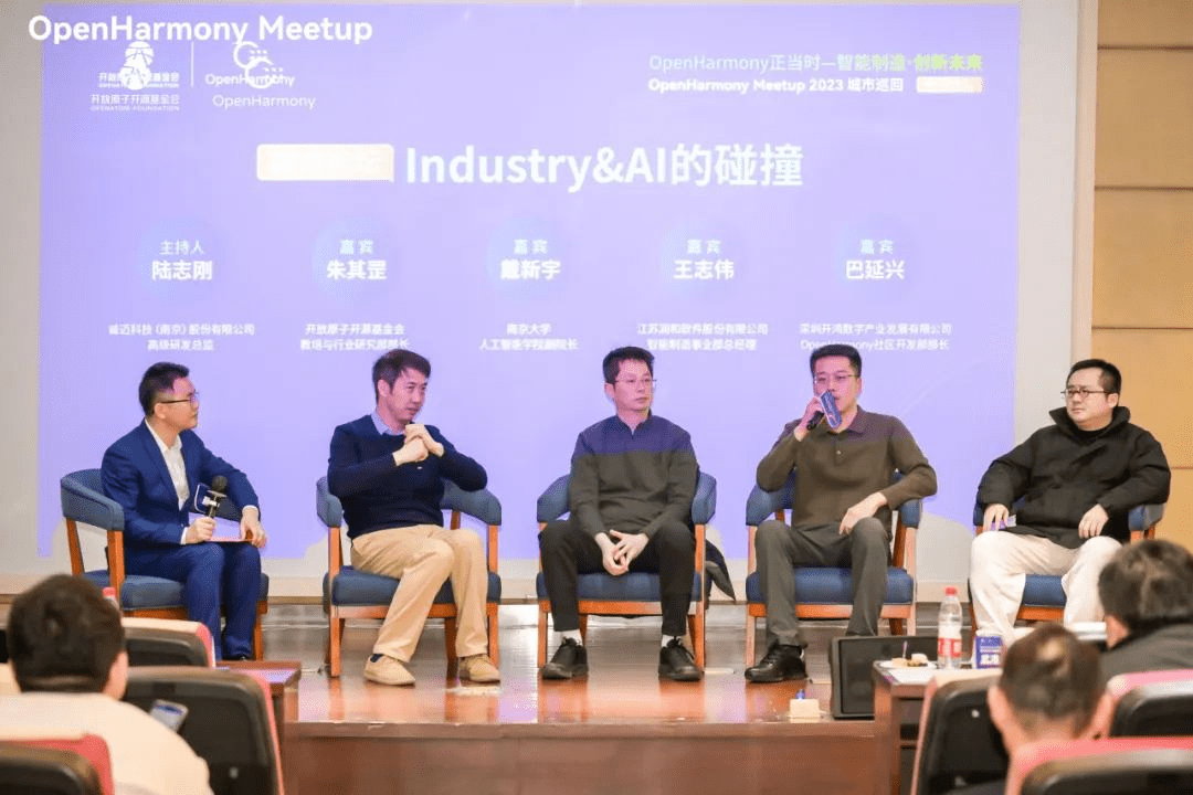 圆桌论坛环节,在诚迈科技高级研发总监陆志刚的主持下,开放原子开源基金会教培与行业研究部部长朱其罡、南京大学人工智能学院副院长戴新宇、润和软件智能制造事业部总经理王志伟、深开鸿OpenHarmony社区开发部部长巴延兴四位嘉宾,围绕“Industry&AI的碰撞”这一话题进行了多维度、深层次讨论。