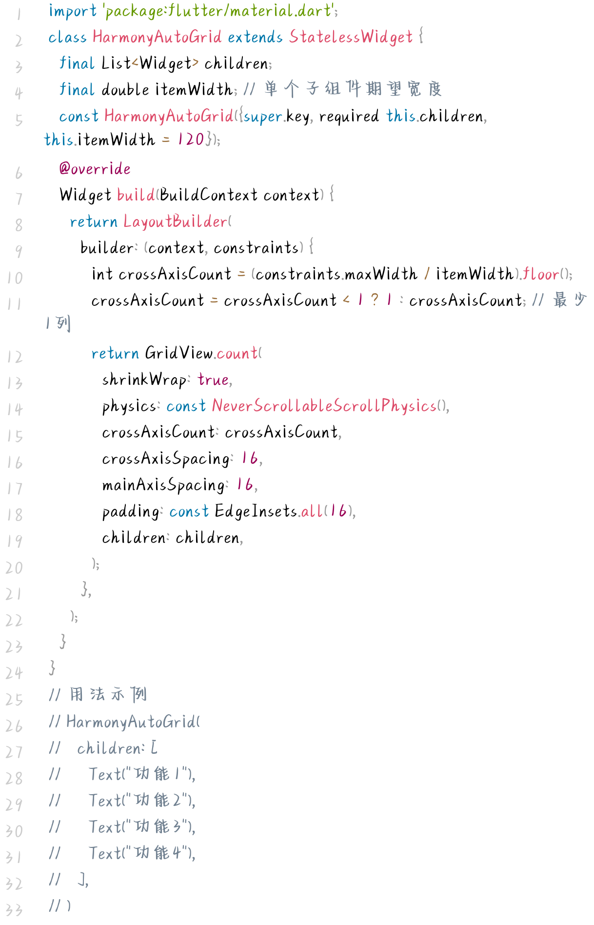 - 自适应列数:根据屏幕宽度与子组件期望宽度自动计算列数,适配多设备屏幕,无需手动写多套布局;