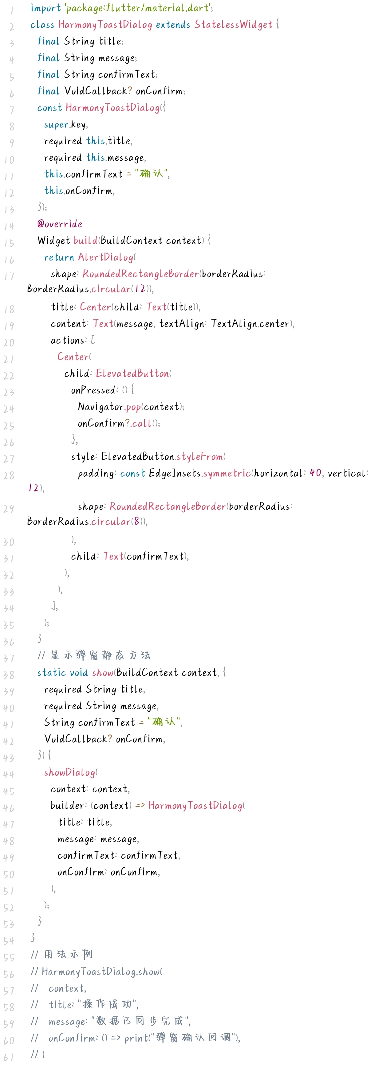 实现带鸿蒙风格的轻量级操作提示弹窗,适配成功提示、失败提示、确认询问等场景,样式简约、交互简洁,避免自定义弹窗与系统风格冲突,提升用户操作反馈体验。