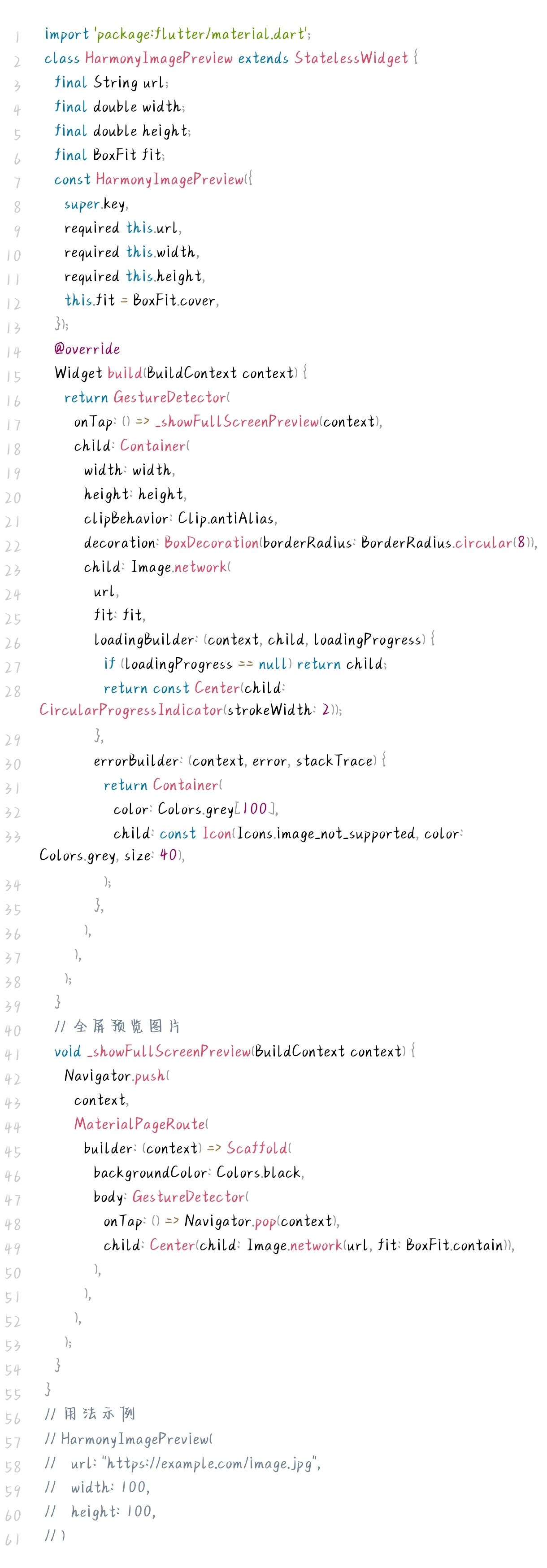 - 轻量无依赖:基于Flutter原生 Image.network 封装,无第三方依赖,兼容性强。