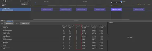 在“Snapshot”的“Comparison”页签中,可进行两次快照的差异比较,比较内容包括新增数、删除数、个数增量、分配大小、释放大小、大小增量等等。通过不断对比,可快速分析和定位内存问题的具体位置。