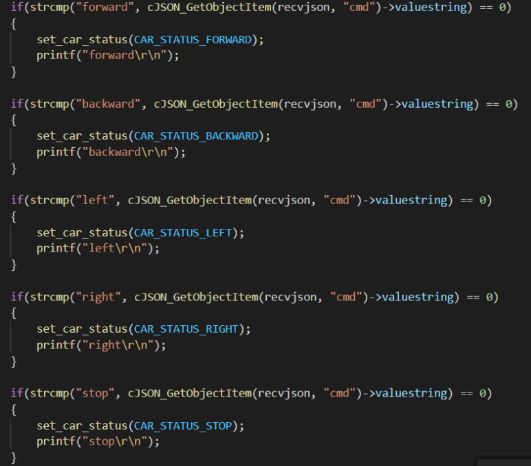 我们在小车上面简单编写一个UDP程序,监听50001端口号。这里使用的通信格式是json,小车收到UDP数据后,解析json,并根据命令执行相应的操作,例如前进、后退、左转、右转等,代码如下: