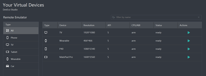 第三步,因为目前手上还没有鸿蒙系统的手机,我就先用了 Tools->HVD Manager 里提供的模拟器功能先跑一下。