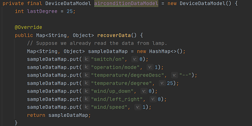 同时在SampleDeviceDataHandler.java中模拟了一个虚拟的空调设备数据: