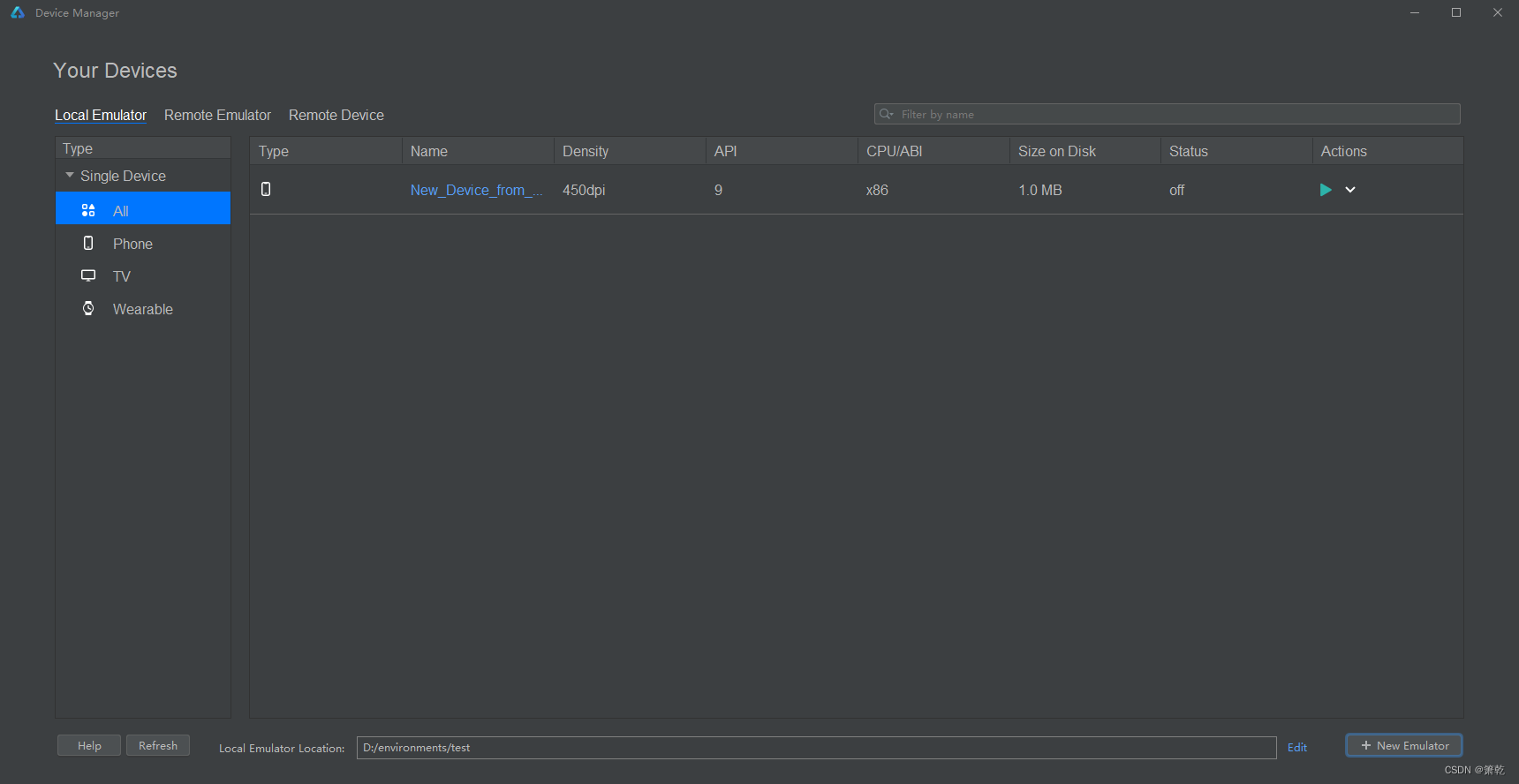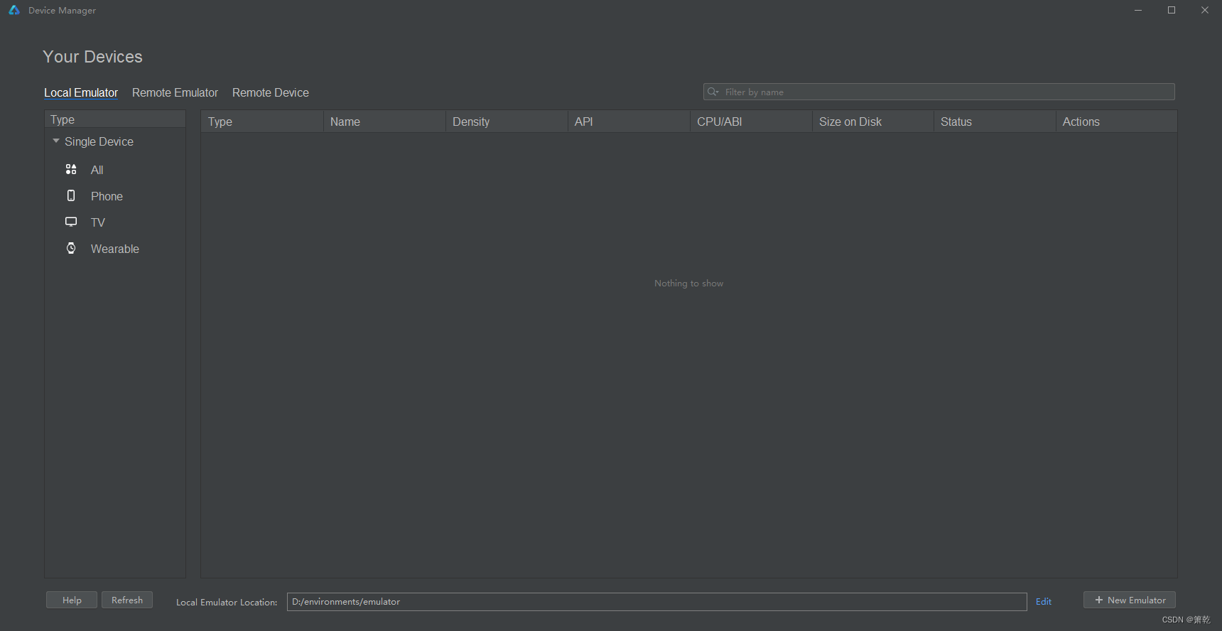 2.选择Local Emulator,设置合适的Local Emulator Location存储地址,然后单击’+New Emulator’。