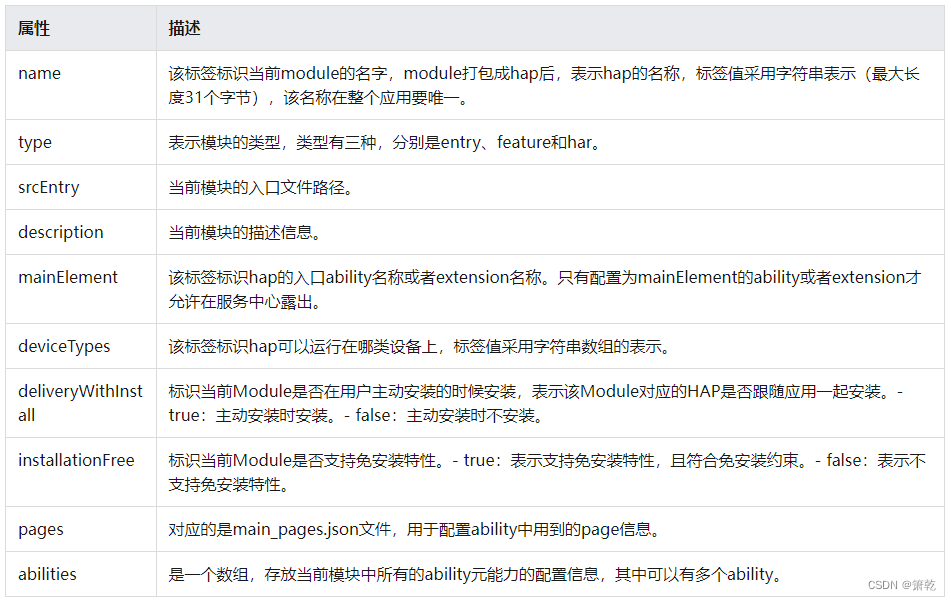 其中module对应的是模块的配置信息,一个模块对应一个打包后的hap包,hap包全称是HarmonyOS Ability Package,其中包含了ability、第三方库、资源和配置文件。其具体属性及其描述可以参照下图: