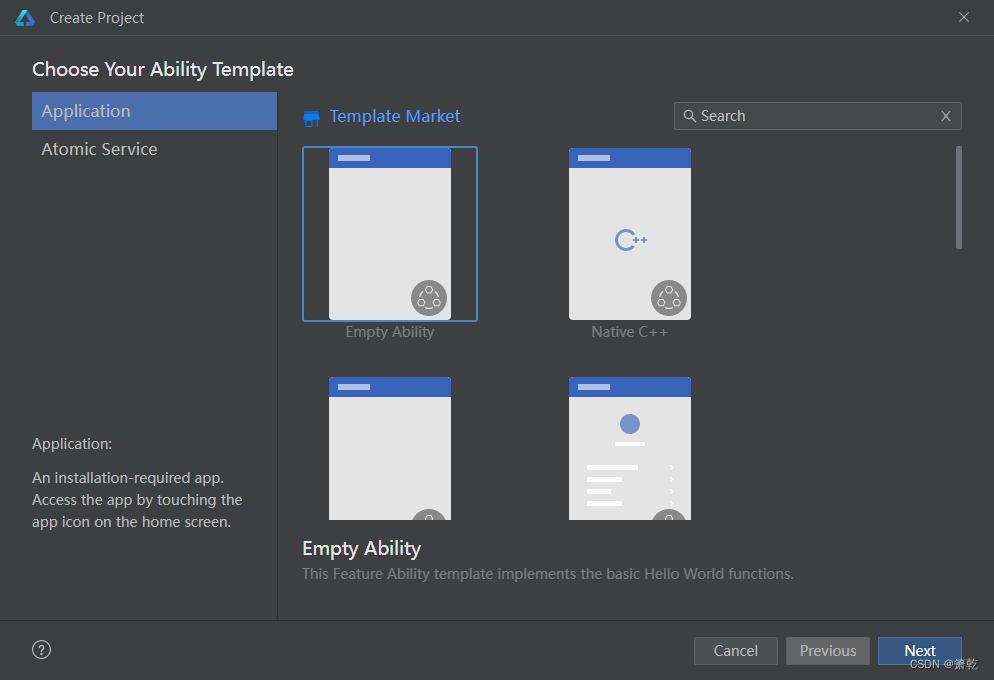 选择‘Application’,然后选择‘Empty Ability’,单击‘Next’进入工程配置页。