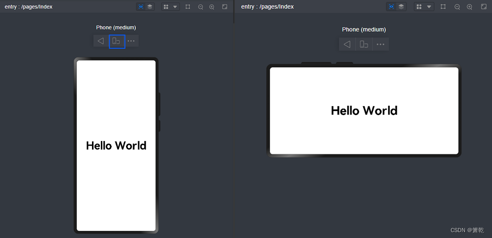 预览器提供了一些基本功能,包括旋转屏幕,切换显示设备及多设备预览等。单击旋转按钮,可以切换竖屏和横屏显示的效果。
