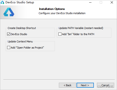 如下安装选项界面勾选DevEco Studio后,单击“Next”,直至安装完成。