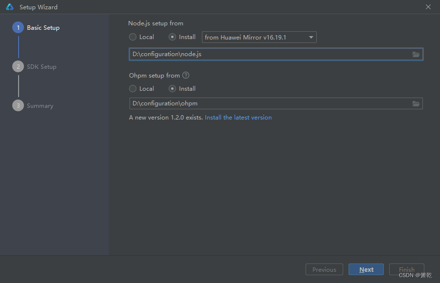 进入DevEco Studio配置页面,首先需要进行基础配置,包括Node.js与Ohpm的安装路径设置,选择从华为镜像下载至合适的路径。