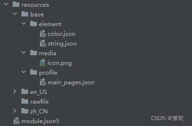 resources目录下存放模块公共的多媒体、字符串及布局文件等资源,分别存放在element、media文件夹中。