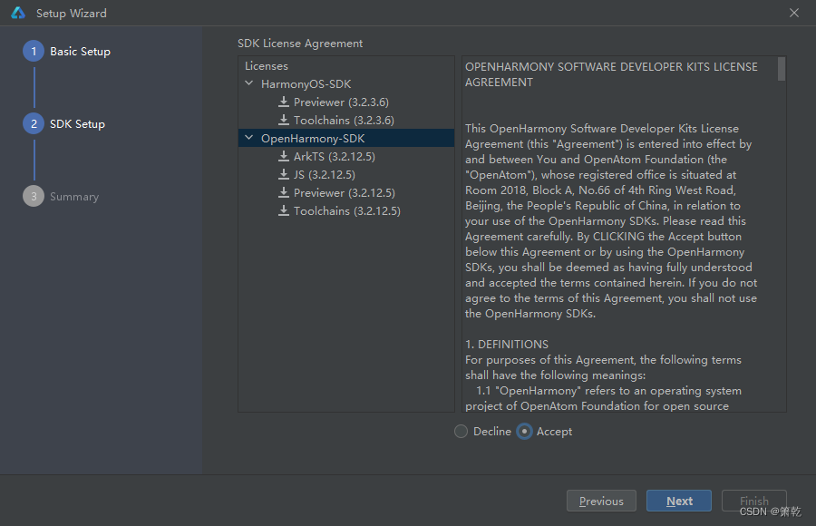 点击'Next'后会显示'SDK License Agreement',阅读相关协议后,勾选'Accept'。