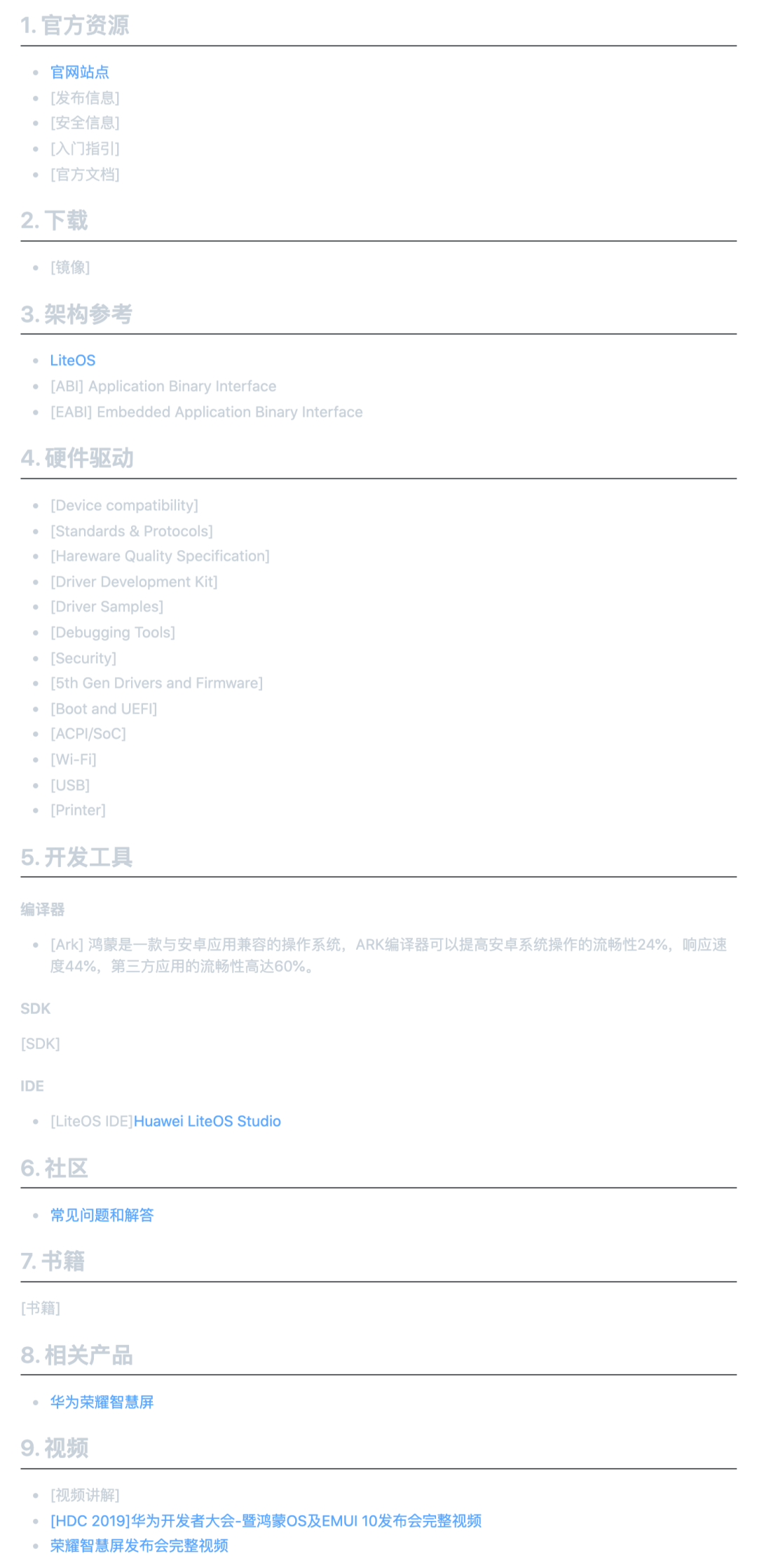 项目内的内容还算丰富,除了最新消息外,还有官方资源链接、产品、视频教学、架构参考等内容,对鸿蒙感兴趣的伙伴们不要错过了。