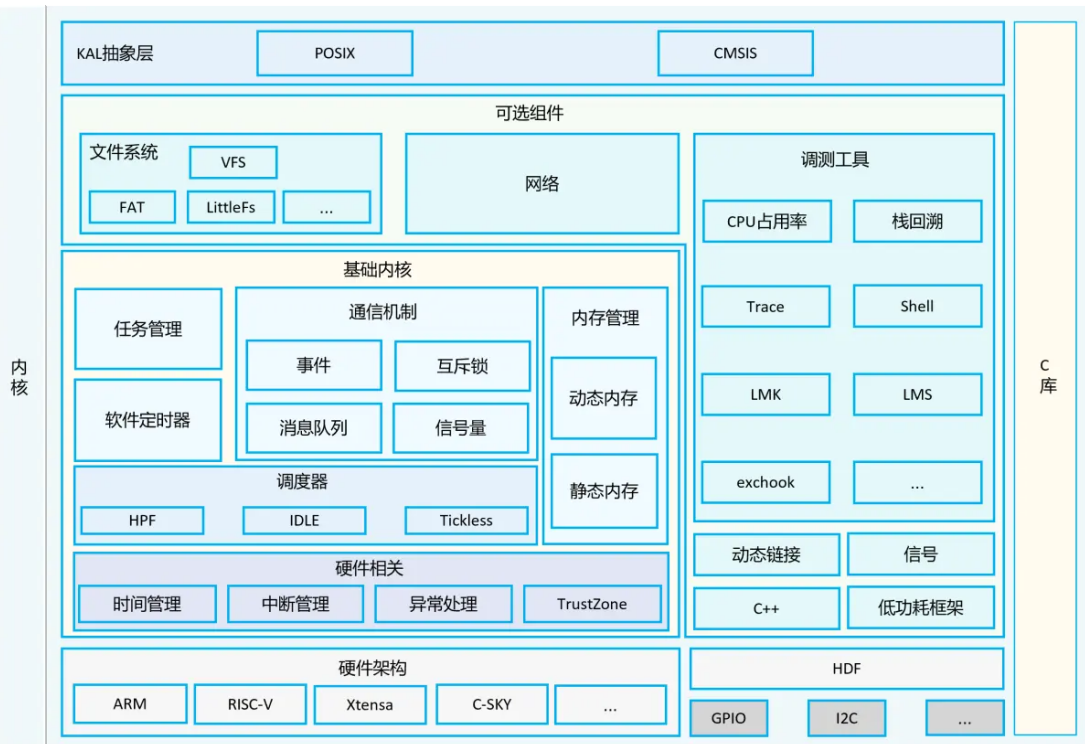 - 特性:面向IoT领域的轻量级物联网操作系统内核,具有小体积、低功耗、高性能的特点。它主要面向MCU类处理器(如Arm Cortex-M、RISC-V 32位)的设备,支持的设备最小内存为128KiB。LiteOS-M内核架构包含硬件相关层和硬件无关层,硬件相关层提供统一的HAL接口,硬件无关层则包括基础内核模块和扩展模块,提供网络、文件系统等组件能力。LiteOS-M内核代码结构简单,它支持多任务,采用抢占式调度机制,支持32个优先级,并提供任务管理、内存管理、中断管理等功能。