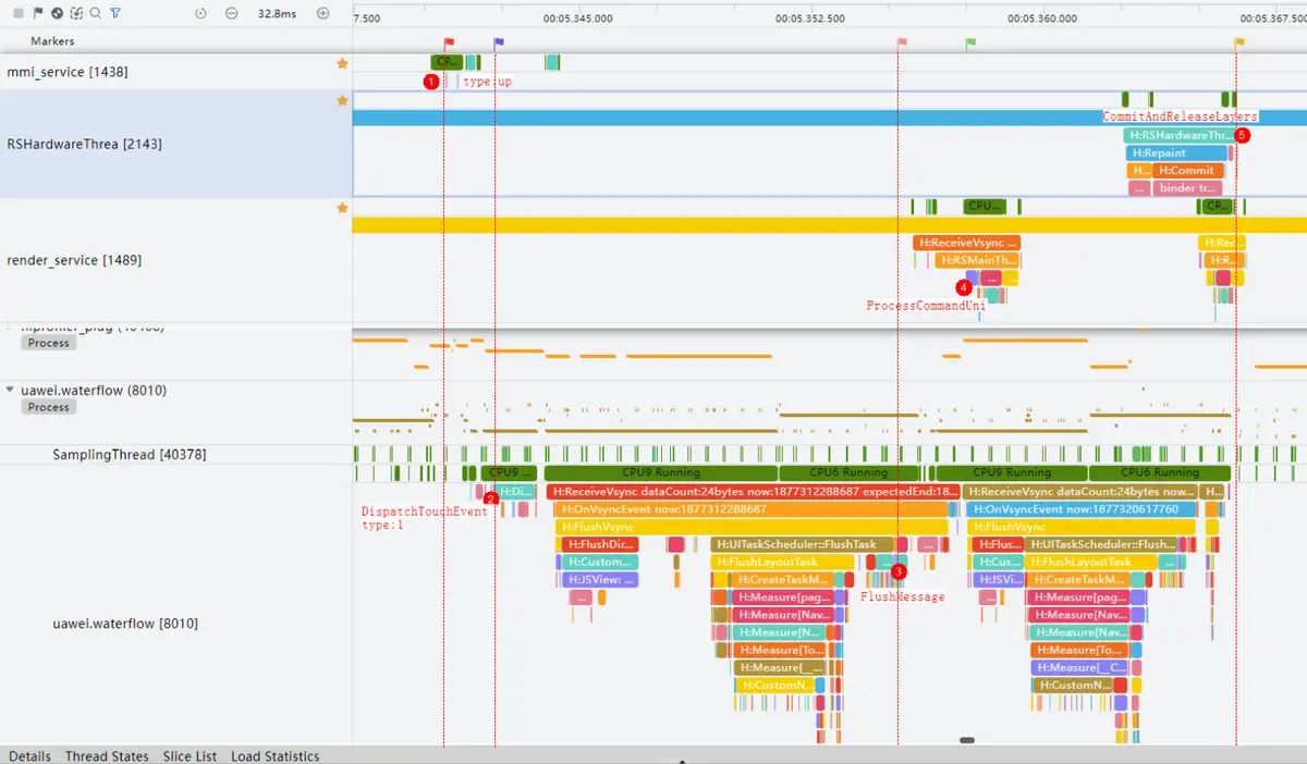 其中,应用阶段(如下图中标记2与3之间的部分)是开发者需要关注优化的部分,一般来说,应用阶段耗时若超过25ms的基线,加上机器硬件的30ms左右耗时,整体的时延就可能超过100ms的标准,导致点击响应体验不佳,需要进一步定位性能问题。