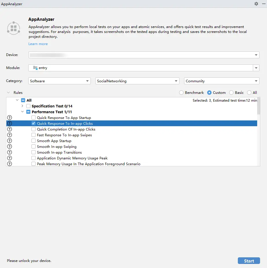 AppAnalyzer是DevEco Studio中提供的检测评分工具,用于测试并评价HarmonyOS应用或元服务的质量,能快速提供评估结果和改进建议。当前AppAnalyzer支持的测试类型包括兼容性、性能、UX测试和最佳实践等。其中点击操作响应是性能类型中的一项检测规则,开发者可以使用该工具检测响应性能。
