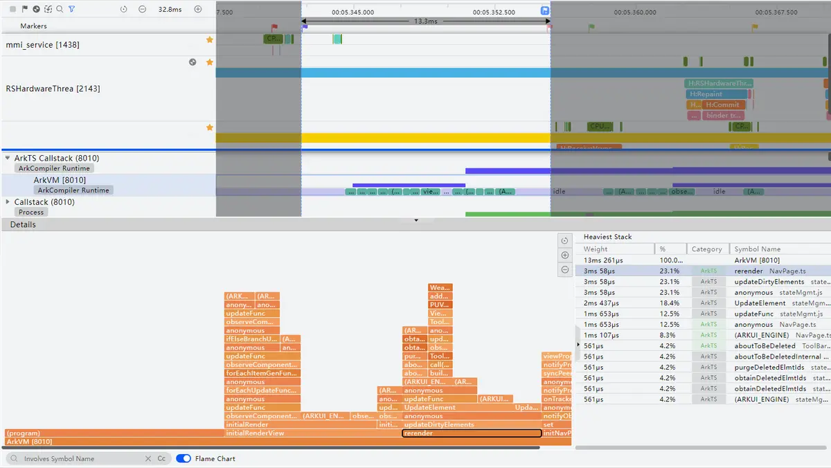- 分析定位原因:针对框选的应用阶段,分析主进程泳道,观察是否有耗时长的函数阻塞主线程;是否有超长耗时单帧。如果有长段的ExecuteJs 可以查看具体的调用栈或火焰图,定位耗时函数;如果是FlushLayoutTask阶段耗时,就需要结合UI组件树去分析,布局是否合理,是否有优化空间。