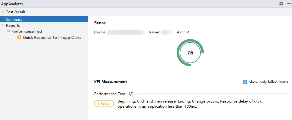 - 获得检测结果。例如下图结果,表示点击响应性能检测失败,说明评测应用达不到100ms响应标准,存在进一步优化的空间。
