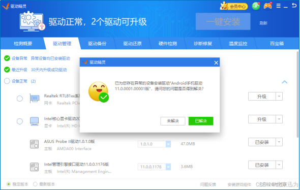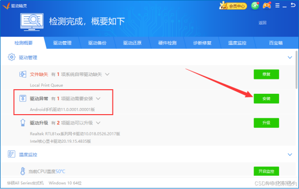 4)检测完成后可看到驱动异常提示, 点击安装。