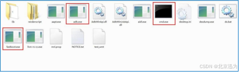 在这个文件夹中,里面有几个小程序需要给大家介绍一下。如下图,方框中的三个小程序“cmd.exe”“adb.exe”“fastboot.exe”。