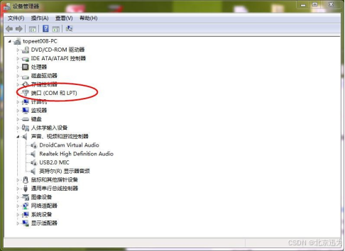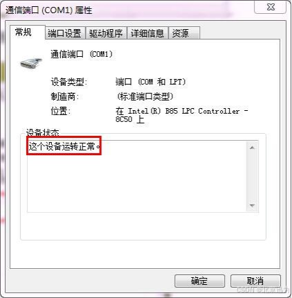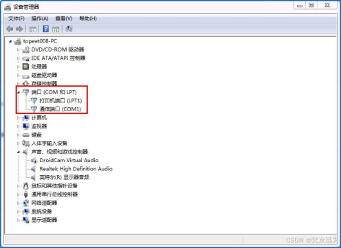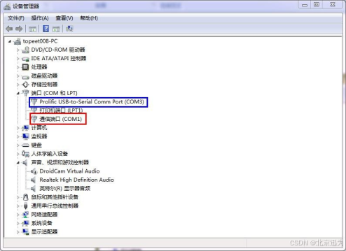 如下图,红色矩形框中显示机器只有一个串口 COM1,作者的机器自带串口,所以有COM1。