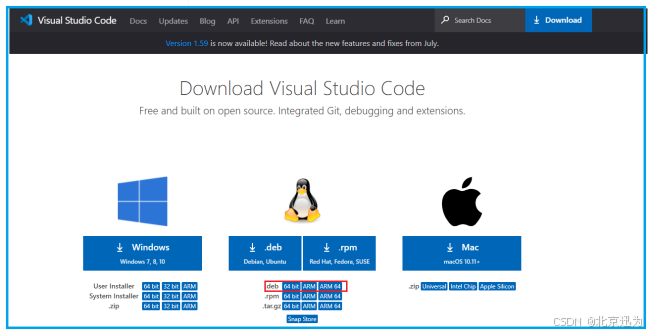 首先进入官网下载,*(Download Visual Studio Code - Mac, Linux, Windows)*进入如下页面,选择适合自身版本的Linux的.deb版本下载,也可以直接使用我们提供好的安装包。