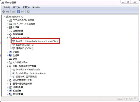 7)然后将‘USB 转串口线’连接电脑的 USB 接口。设备管理器显示如下图所示,将下图和上图对比,可以发现下图中多出了红色矩形框中的内容,其中 COM3 编号就是接到电脑USB 后,系统给你分配的串口编号。(这里需要提醒一下,用户插入的 USB 接口不一样,显示的端口号也会不一样,大家只需要关注‘USB 转串口’插入后,增加的那一个串口号,这个增加的串口号需要大家记住,在超级终端的设置中会用到。)