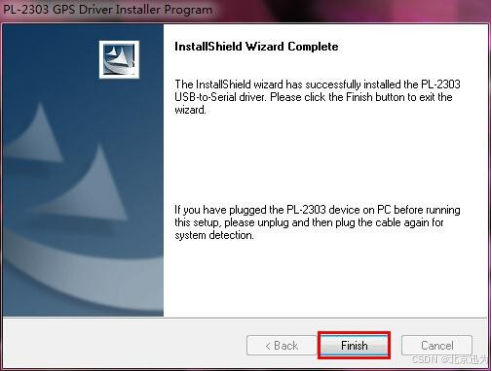 5)如下图,提示驱动的安装已经完成,单击“Finish”,结束‘USB 转串口’驱动安装。