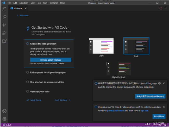 至此我们在windows环境下的Visual Studio Code就安装成功了,打开软件之后会显示如下界面: