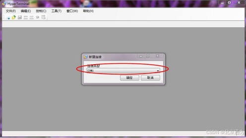 2)然后执行菜单命令“文件(F)”-->“新建连接(N)”,出现下图界面。这里需要注意的是,下面的 COM1,用户应该根据自己机器的实际情况选用串口号,如果不清楚可以参考3.1.1 小节。单击“确定”,继续设置。