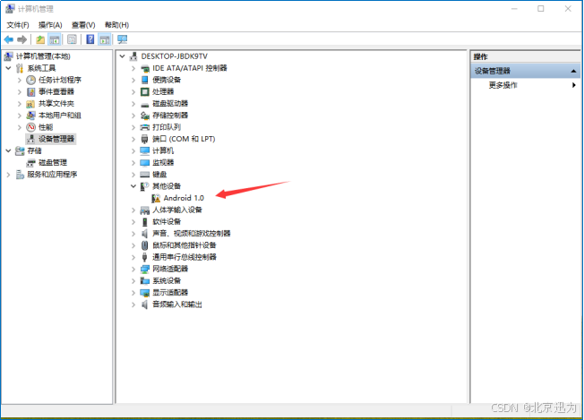 进入 windows 的设备管理器,如下图发现Android 1.0,没有发现 ADB 设备,可往下进行。
