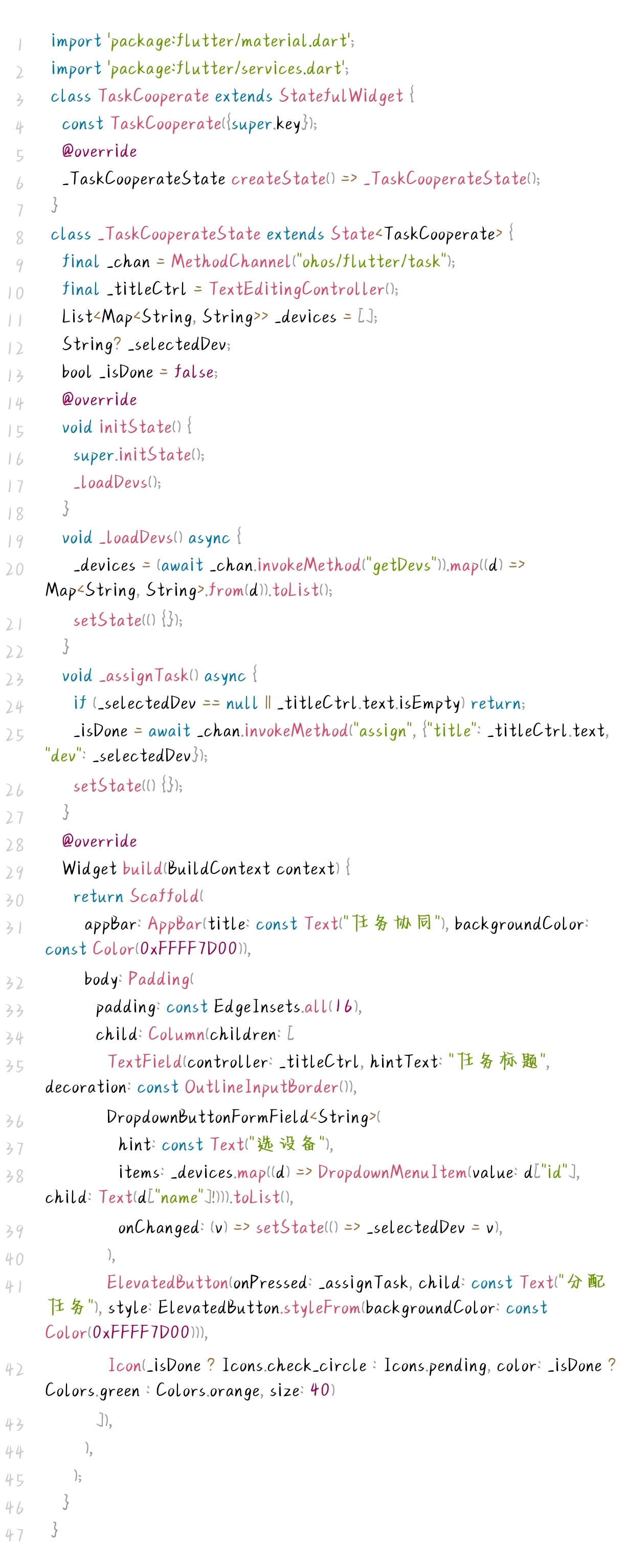 开源鸿蒙分布式能力实现多设备无缝协同,Flutter保障跨端UI一致性,二者融合无需深耕底层,以极简代码即可落地实用协同功能。本文聚焦3大高频场景,代码极致精简无冗余,同时补充技术原理、适配细节与避坑要点,兼顾落地效率与认知深度。