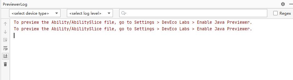 新版的DevEco Studio 默认并不启用Java预览器,因此,选中Ability/AbilitySlice文件并切换预览器时,会包如下告警提示: