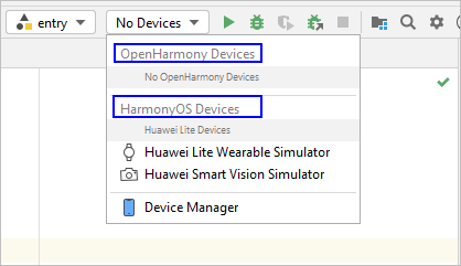 - 在DevEco Studio右上角选择对应的设备,请根据步骤1查询的应用类型选择设备类型。