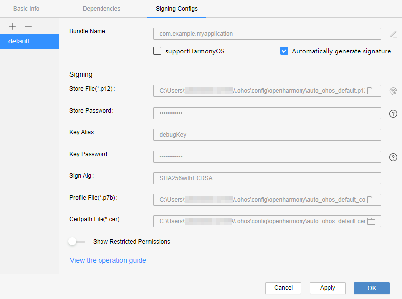 - 打开File > Project Structure > Project > Signing Configs,根据步骤1检查的结果,如果是HarmonyOS应用,则请勾选上“supportHarmonyOS”参数;如果是OpenHarmony应用,则无需勾选。DevEco Studio会自动对应用进行签名。