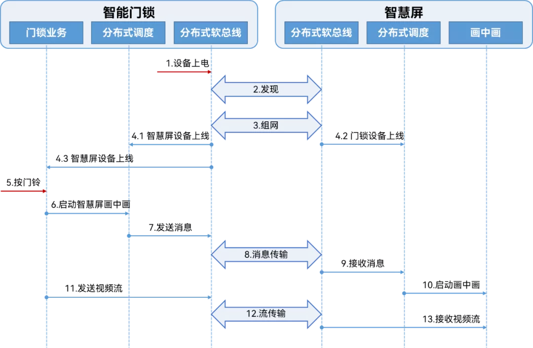 说明:为了方便理解,图4略去了设备管理子系统和分布式硬件子系统的处理流程。业务实际是通过分布式设备管理收到的设备上线的通知;门锁捕获摄像头视频和摄像头视频画中画播放,涉及到业务通过分布式硬件子系统提供的摄像头虚拟化能力。