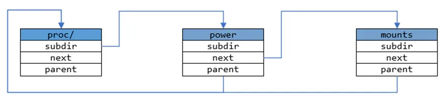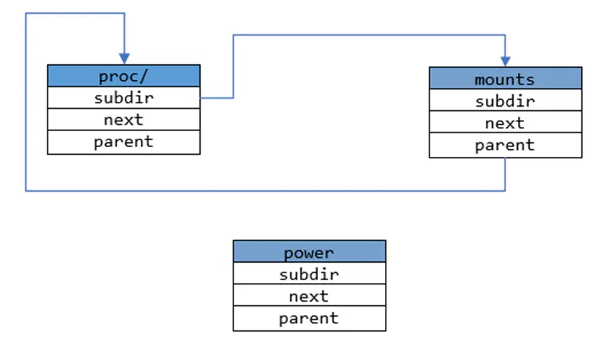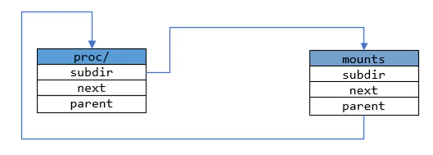 为了更好地说明,假设目前已经在系统中生成了proc/和mounts节点,proc/节点就是该文件系统的根节点,此时两者的关系可以用下图表示: