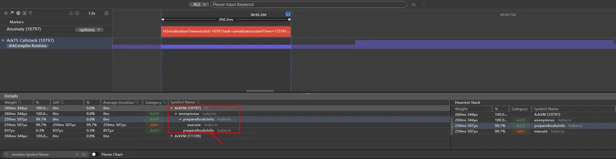 通过点击下方ArkTS Callstack泳道,选取这个序列化超时发生的时间段后,可以通过下方的Callstack信息定位到此时正在执行Index.ts文件中的prepareBooksInfo方法,由上方伪代码可知该方法内调用了taskpool.execute方法,向子线程中传递对象dbInfo,触发了主线程序列化过程。