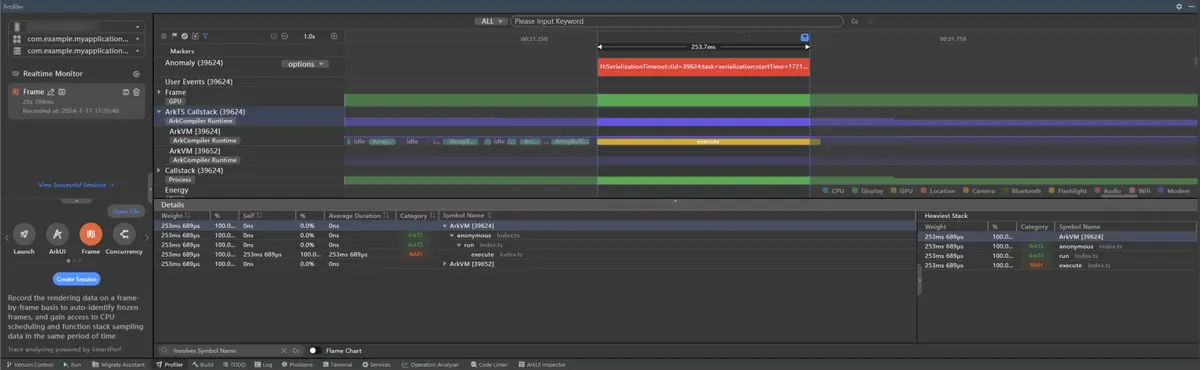 DevEco Studio新增主线程序列化和反序列化检测能力,同时支持配置序列化/反序列化超时阈值。对于超过阈值的序列化和反序列化操作,在泳道中给出告警提示,并可以关联该时刻的调用栈信息,更好地帮助开发者定位性能问题。