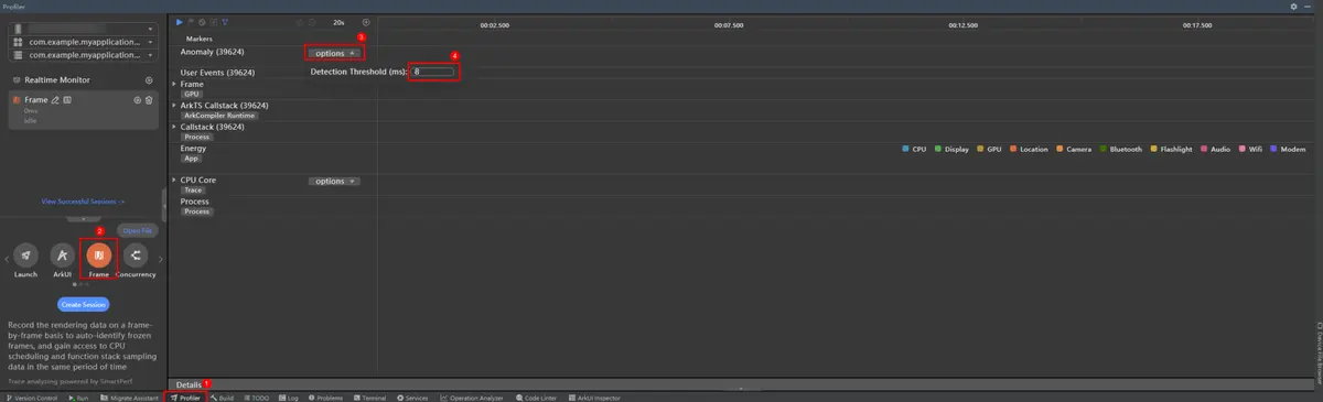 - 启动应用,点击Profiler,选择Frame模板,点击Anomaly泳道中的options,在弹出的输入框中输入超时阈值。