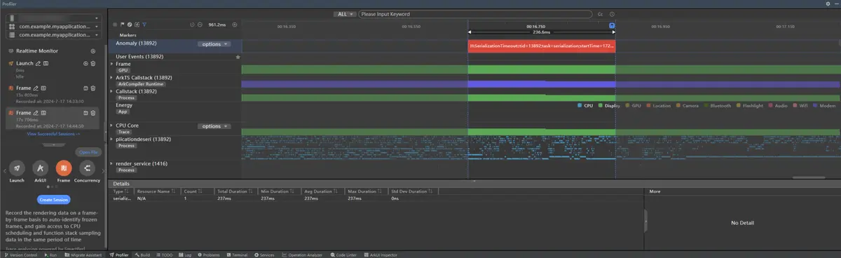 为了帮助开发者更好的识别其代码中潜在的涉及主线程序列化/反序列化的耗时点,以及推动开发者在跨线程传递对象时改用 Sendable 对象的方式,方舟调优和DevEco Studio联合开发并上线了应用主线程序列化/反序列化超时检测工具。该工具集成在 DevEco Profiler 中,并可在开发者进行应用调优录制时同步开启。开发者可以在录制结果中的 Anomaly泳道 内查看到主线程序列化/反序列化超时的Tag点和相关超时信息,并通过与ArkTS Callstack泳道中当前调用栈的时间对齐,定位到序列化/反序列化耗时较长的代码,然后通过Sendable改造或者通信数据改造的方式(例如文件buffer改为文件path+偏移)进行优化,提升应用性能。