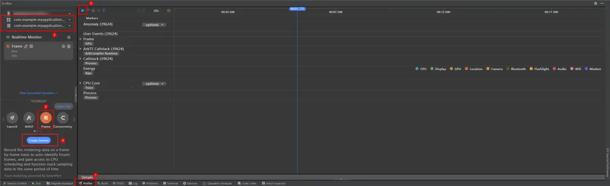 - 启动应用,点击Profiler,选择Frame模板,选择当前应用进程,点击Create Session,然后开始录制Frame insight场景数据,录制过程中可正常操作应用。