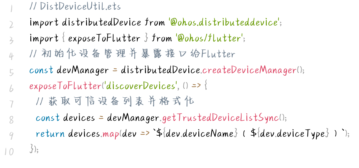 通过鸿蒙分布式设备管理能力,在Flutter侧实现周边可信设备的扫描与信息展示。