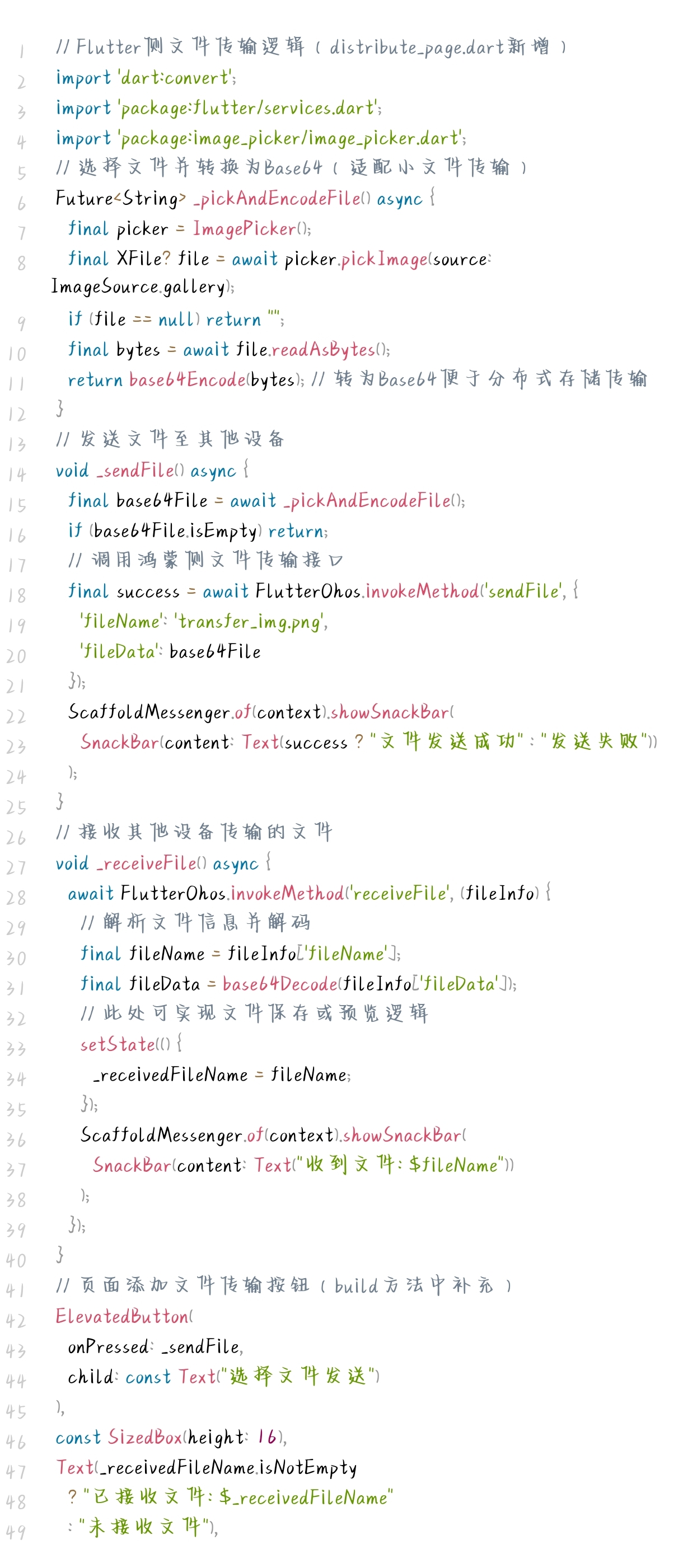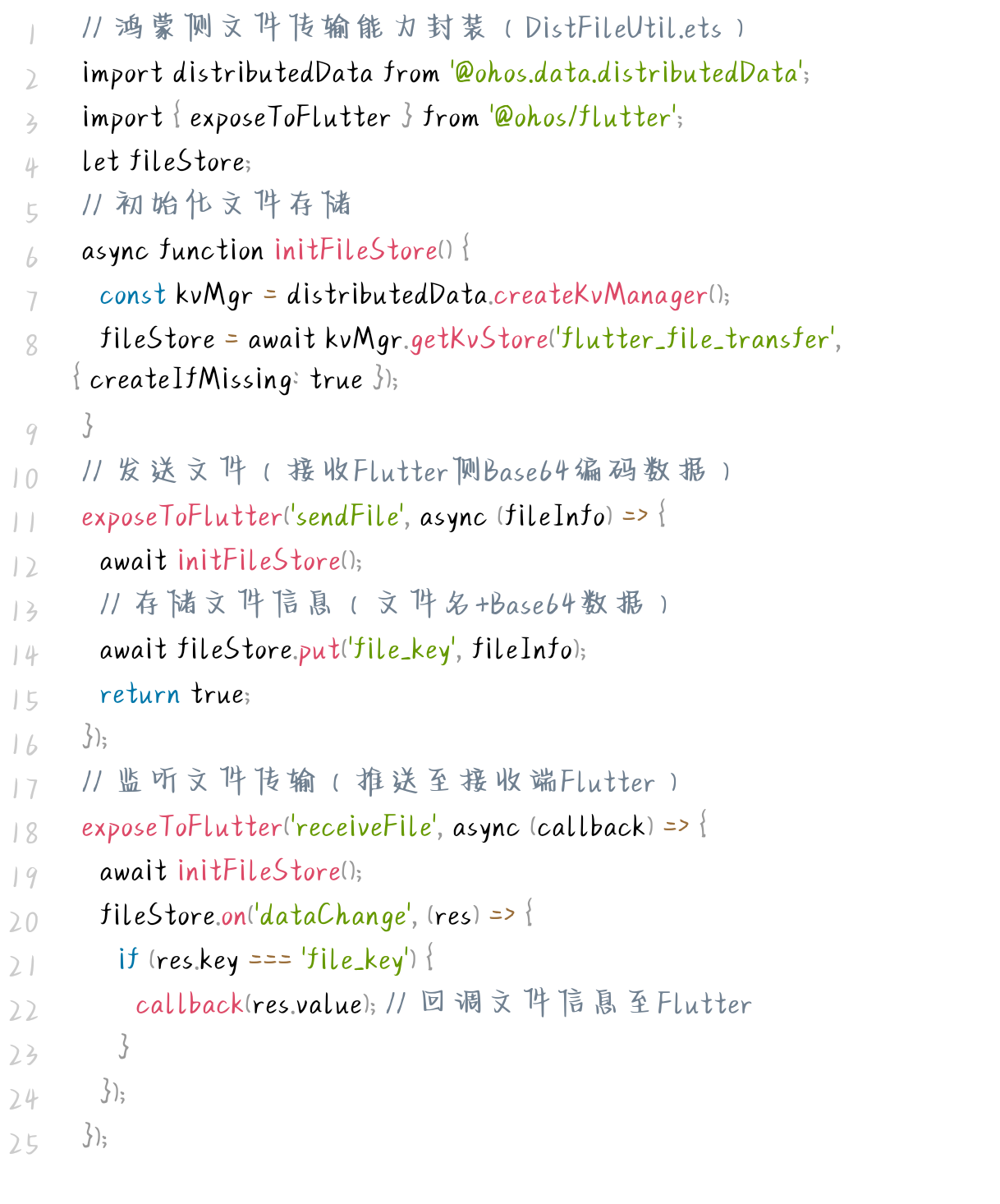 除数据同步与指令交互外,跨设备文件传输是分布式协同的高频需求。以下通过极简代码实现鸿蒙设备间小文件(如图片、文档)的快速传输,核心复用分布式数据存储能力,避免复杂通信协议开发。